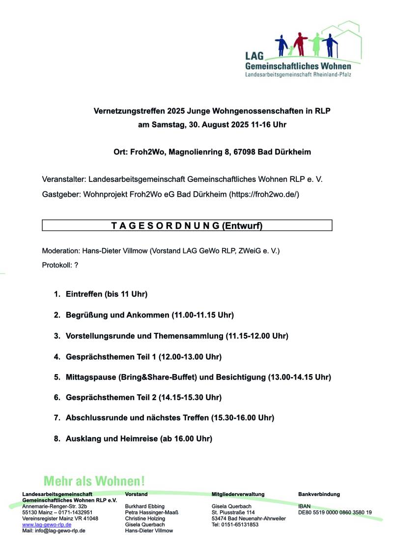 wir als Landesarbeitsgemeinschaft Gemeinschaftliches Wohnen Rheinland-Pfalz e.V. laden ein zum Vernetzungstreffen 2025 Junge Wohngenossenschaften in RLP am Samstag, 30. August 2025 von 11-16 Uhr.