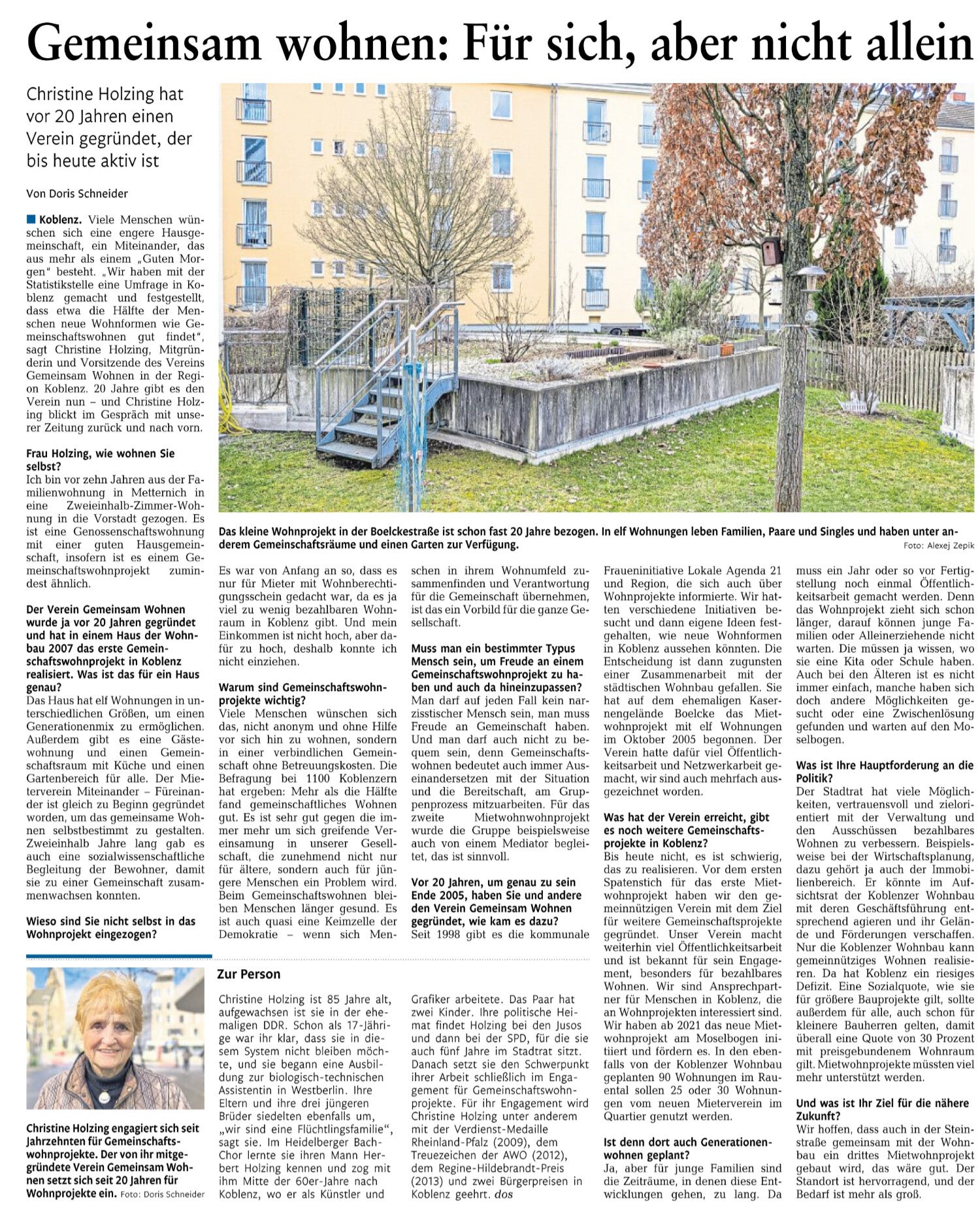 Die Rheinzeitung veröffentlicht in der Ausgabe vom Samstag dem 18. Oktober einen Artikel über den Wechsel an der Führungsspitze der Koblenzer Wohnbau.